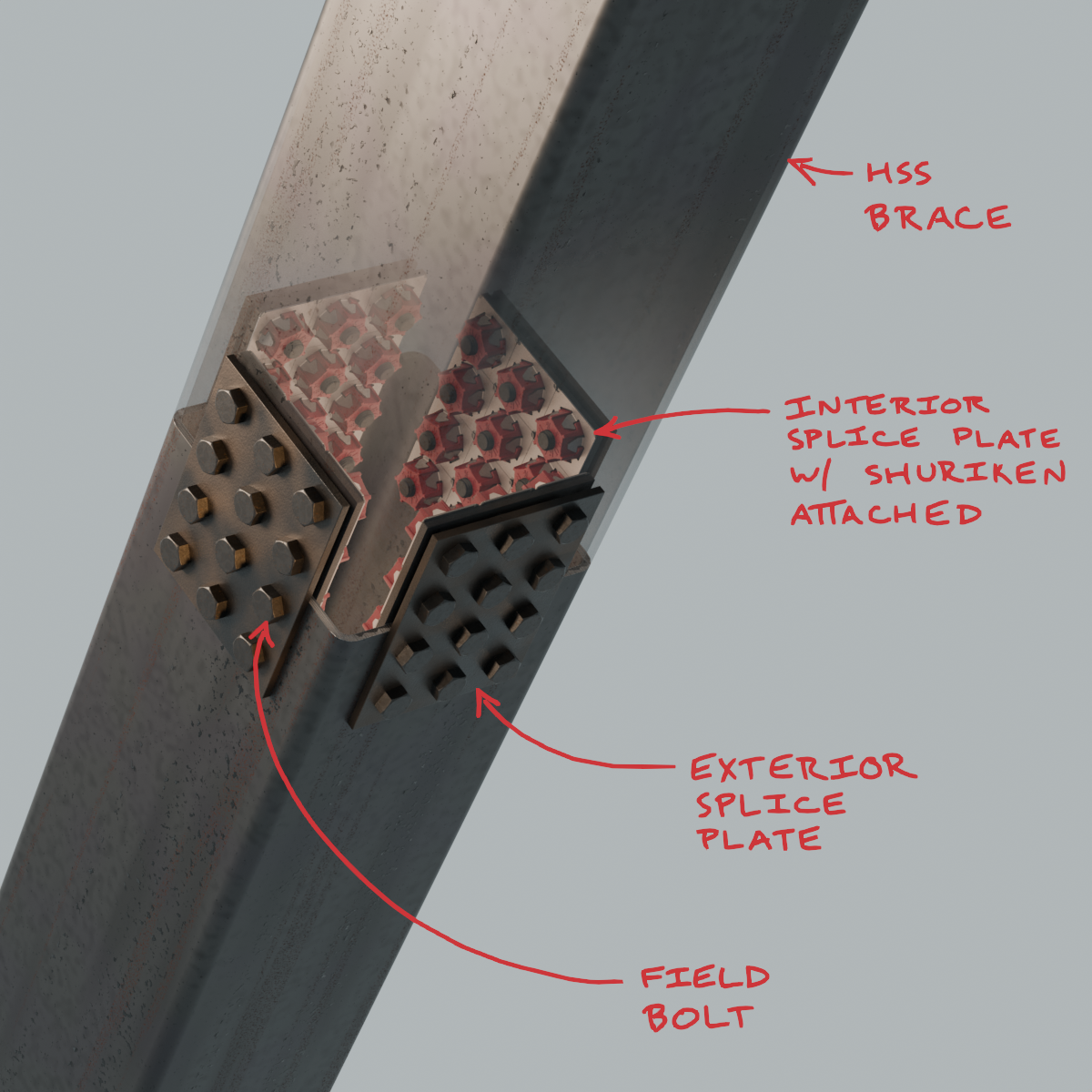 Once the material reached the field, erectors were able to quickly complete the splices and erect the braces. It was the erector’s first time using Shuriken, but the use of standard bolts installed with standard tools minimized the learning curve. According to Lee, that familiarity and the ability to install slip-critical connections is what set Shuriken apart. “This was the only blind option that I was comfortable with,” he said.